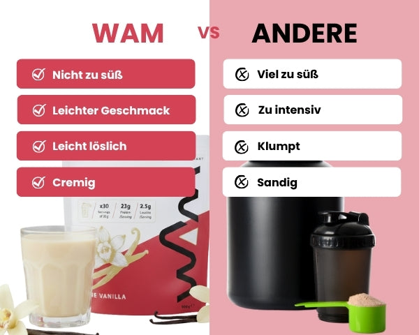 WAM Proteinpulver ist frei von künstlichen Süßstoffen wie Sucralose, Aspartam oder Acesulfam-K, was es leichter verdaulich macht als die meisten anderen Optionen. Stattdessen wird WAM Protein mit einer kleinen Menge Stevia gesüßt, um die individuellen Aromen zu betonen. Wir haben darauf geachtet, dass unser Proteinshake nicht zu süß ist, damit du ihn nach deinem Geschmack anpassen kannst.